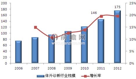 前瞻產業(yè)院《2013-2017年中國體外診斷行業(yè)市場需求預測與投資戰(zhàn)略規(guī)劃分析報告》數據顯示,2006年以來,國內體外診斷產業(yè)以15%左右的年增長率呈現(xiàn)高速增長態(tài)勢。據統(tǒng)計,2008年我國體外診斷市場規(guī)模已達95億元,2010年增長至122億元,2011年突破140億元,到2012年,我國體外診斷市場規(guī)模約為175億元。