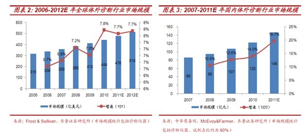 據(jù)McEvoy & Farmer 的市場(chǎng)報(bào)告《中國(guó)臨床診斷市場(chǎng)(2011)》預(yù)測(cè),我國(guó)體外診斷行業(yè)未來(lái)增速有望達(dá)到15%-20%,遠(yuǎn)遠(yuǎn)超過(guò)全球5%-7%的增長(zhǎng),至2015 年成為全球第三大市場(chǎng);
